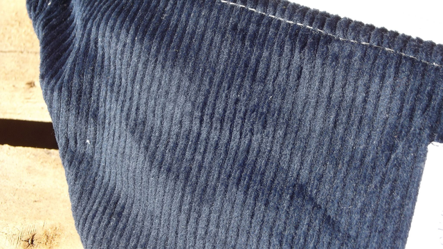 Sac banane couleur bleu marine en velours côtelé, intérieur en coton avec des soleils et nuages , une poche intérieure, sangle bleue, fermoir latéral blanc.